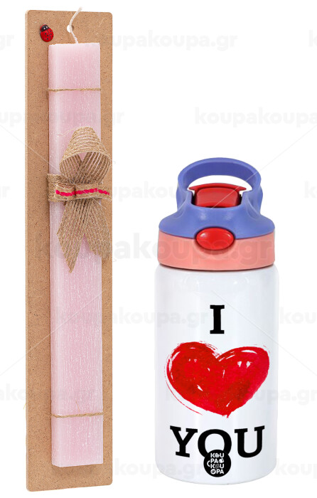 I Love You, Πασχαλινή Λαμπάδα με Παιδικό παγούρι θερμό, ανοξείδωτο, με καλαμάκι ασφαλείας, ροζ/μωβ (350ml) & κερί αρωματικό πλακέ (30cm) (ΡΟΖ)