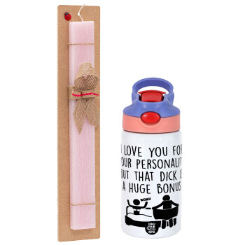 I Love You for Your Personality But that D... Is a Huge Bonus , Πασχαλινή Λαμπάδα με Παιδικό παγούρι θερμό, ανοξείδωτο, με καλαμάκι ασφαλείας, ροζ/μωβ (350ml) & κερί αρωματικό πλακέ (30cm) (ΡΟΖ)