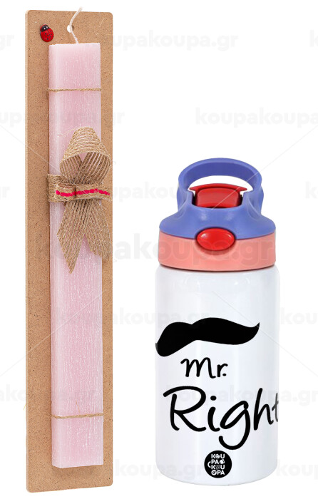 Mr right Mustache, Πασχαλινή Λαμπάδα με Παιδικό παγούρι θερμό, ανοξείδωτο, με καλαμάκι ασφαλείας, ροζ/μωβ (350ml) & κερί αρωματικό πλακέ (30cm) (ΡΟΖ)