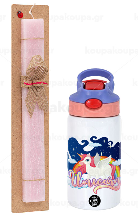 Μονόκερος, Πασχαλινή Λαμπάδα με Παιδικό παγούρι θερμό, ανοξείδωτο, με καλαμάκι ασφαλείας, ροζ/μωβ (350ml) & κερί αρωματικό πλακέ (30cm) (ΡΟΖ)