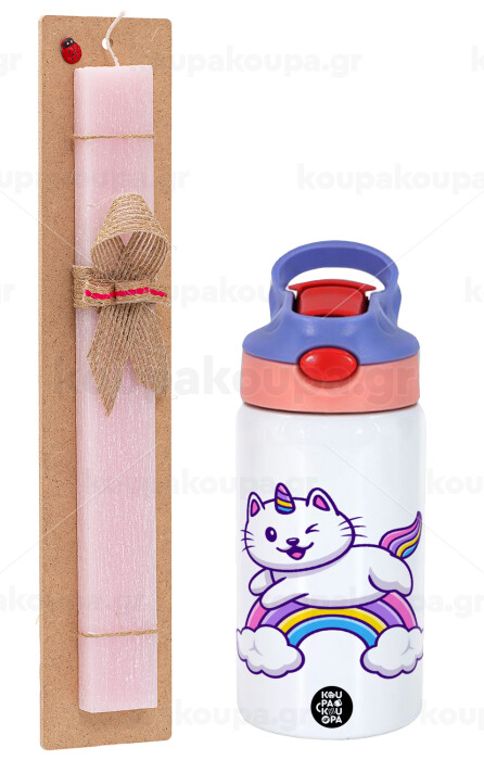 Cute cat unicorn, Πασχαλινή Λαμπάδα με Παιδικό παγούρι θερμό, ανοξείδωτο, με καλαμάκι ασφαλείας, ροζ/μωβ (350ml) & κερί αρωματικό πλακέ (30cm) (ΡΟΖ)