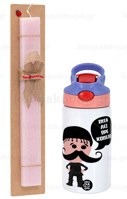 Κρητικός "Ίντα λες ωρέ κοπέλι", Πασχαλινή Λαμπάδα με Παιδικό παγούρι θερμό, ανοξείδωτο, με καλαμάκι ασφαλείας, ροζ/μωβ (350ml) & κερί αρωματικό πλακέ (30cm) (ΡΟΖ)