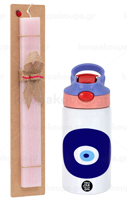 Χάντρα γαλαζιά, Πασχαλινή Λαμπάδα με Παιδικό παγούρι θερμό, ανοξείδωτο, με καλαμάκι ασφαλείας, ροζ/μωβ (350ml) & κερί αρωματικό πλακέ (30cm) (ΡΟΖ)