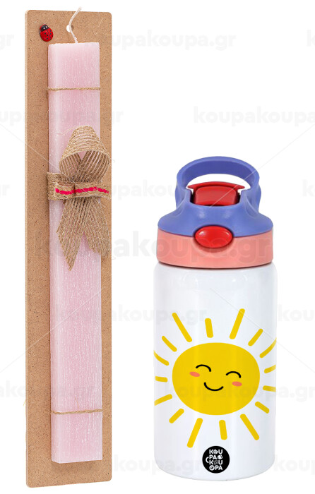 Happy sun, Πασχαλινή Λαμπάδα με Παιδικό παγούρι θερμό, ανοξείδωτο, με καλαμάκι ασφαλείας, ροζ/μωβ (350ml) & κερί αρωματικό πλακέ (30cm) (ΡΟΖ)
