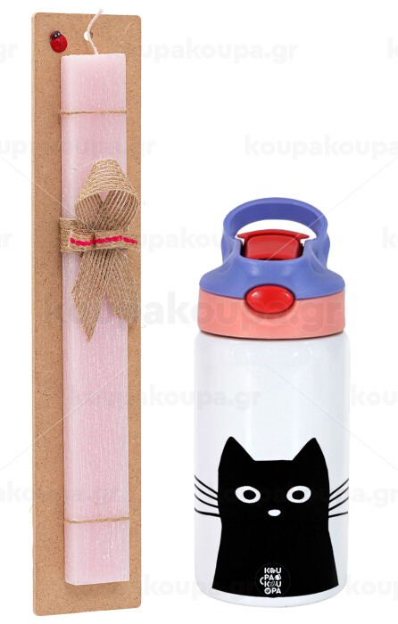 Μαύρη γάτα, Πασχαλινή Λαμπάδα με Παιδικό παγούρι θερμό, ανοξείδωτο, με καλαμάκι ασφαλείας, ροζ/μωβ (350ml) & κερί αρωματικό πλακέ (30cm) (ΡΟΖ)