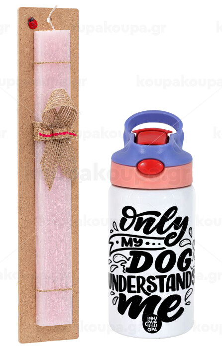 Only my DOG, understands me, Πασχαλινή Λαμπάδα με Παιδικό παγούρι θερμό, ανοξείδωτο, με καλαμάκι ασφαλείας, ροζ/μωβ (350ml) & κερί αρωματικό πλακέ (30cm) (ΡΟΖ)