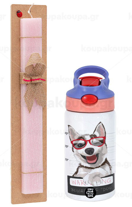 Warning, beware of Dog, Πασχαλινή Λαμπάδα με Παιδικό παγούρι θερμό, ανοξείδωτο, με καλαμάκι ασφαλείας, ροζ/μωβ (350ml) & κερί αρωματικό πλακέ (30cm) (ΡΟΖ)