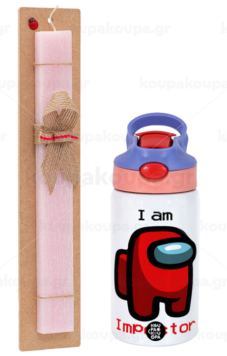 Among US i am impostor, Πασχαλινή Λαμπάδα με Παιδικό παγούρι θερμό, ανοξείδωτο, με καλαμάκι ασφαλείας, ροζ/μωβ (350ml) & κερί αρωματικό πλακέ (30cm) (ΡΟΖ)