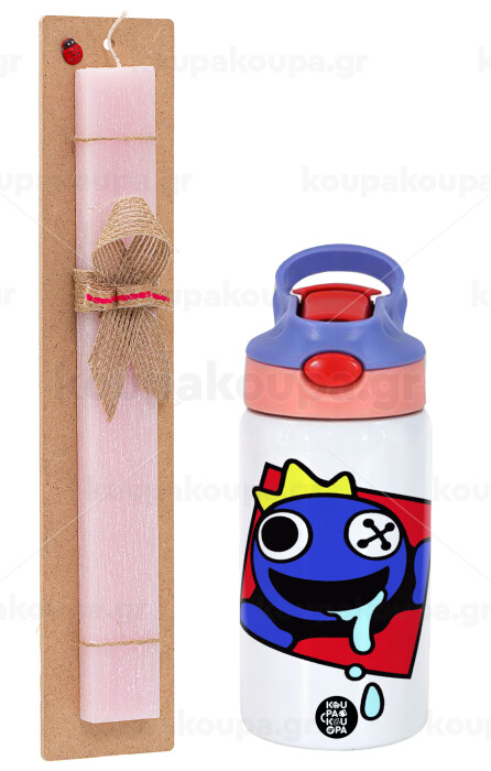 Blue, Rainbow friends, Πασχαλινή Λαμπάδα με Παιδικό παγούρι θερμό, ανοξείδωτο, με καλαμάκι ασφαλείας, ροζ/μωβ (350ml) & κερί αρωματικό πλακέ (30cm) (ΡΟΖ)