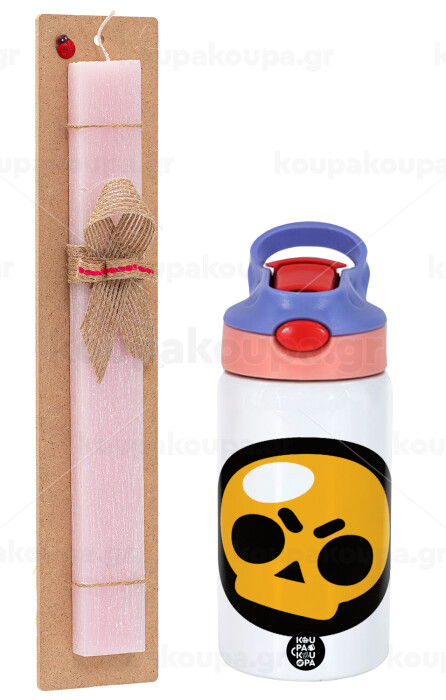 Brawl Stars Skull, Πασχαλινή Λαμπάδα με Παιδικό παγούρι θερμό, ανοξείδωτο, με καλαμάκι ασφαλείας, ροζ/μωβ (350ml) & κερί αρωματικό πλακέ (30cm) (ΡΟΖ)