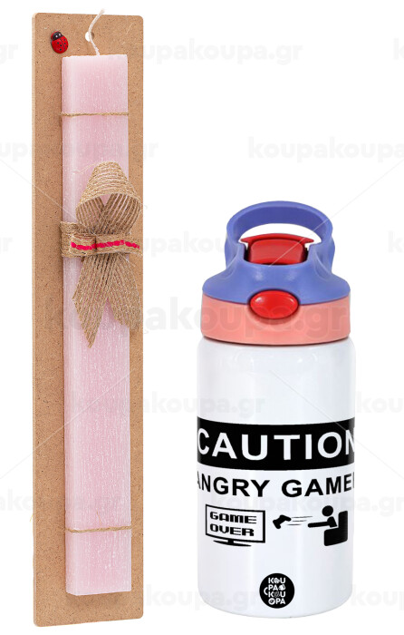 Caution, angry gamer!, Πασχαλινή Λαμπάδα με Παιδικό παγούρι θερμό, ανοξείδωτο, με καλαμάκι ασφαλείας, ροζ/μωβ (350ml) & κερί αρωματικό πλακέ (30cm) (ΡΟΖ)