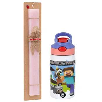 Minecraft Alex, Πασχαλινή Λαμπάδα με Παιδικό παγούρι θερμό, ανοξείδωτο, με καλαμάκι ασφαλείας, ροζ/μωβ (350ml) & κερί αρωματικό πλακέ (30cm) (ΡΟΖ)