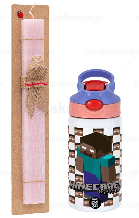 Minecraft herobrine, Πασχαλινή Λαμπάδα με Παιδικό παγούρι θερμό, ανοξείδωτο, με καλαμάκι ασφαλείας, ροζ/μωβ (350ml) & κερί αρωματικό πλακέ (30cm) (ΡΟΖ)