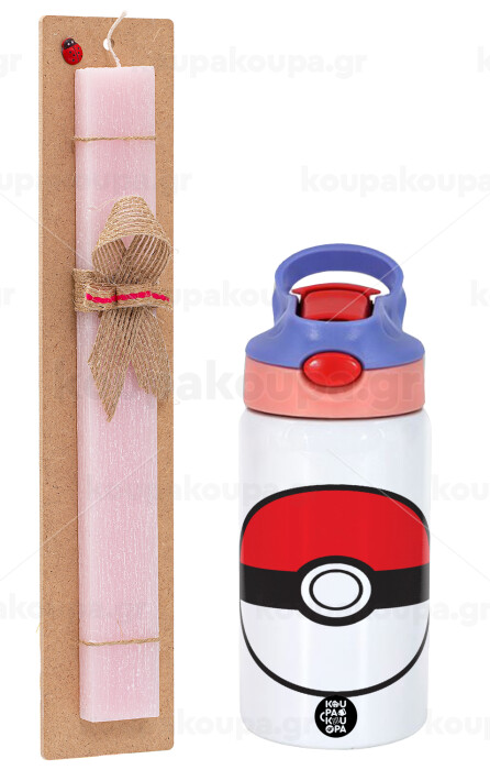 Pokemon ball, Πασχαλινή Λαμπάδα με Παιδικό παγούρι θερμό, ανοξείδωτο, με καλαμάκι ασφαλείας, ροζ/μωβ (350ml) & κερί αρωματικό πλακέ (30cm) (ΡΟΖ)
