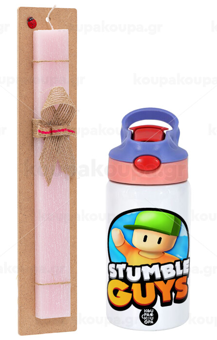 Stumble Guys, Πασχαλινή Λαμπάδα με Παιδικό παγούρι θερμό, ανοξείδωτο, με καλαμάκι ασφαλείας, ροζ/μωβ (350ml) & κερί αρωματικό πλακέ (30cm) (ΡΟΖ)