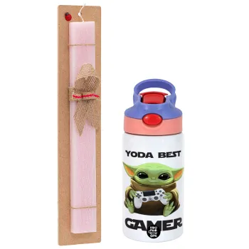 Yoda Best Gamer, Πασχαλινή Λαμπάδα με Παιδικό παγούρι θερμό, ανοξείδωτο, με καλαμάκι ασφαλείας, ροζ/μωβ (350ml) & κερί αρωματικό πλακέ (30cm) (ΡΟΖ)