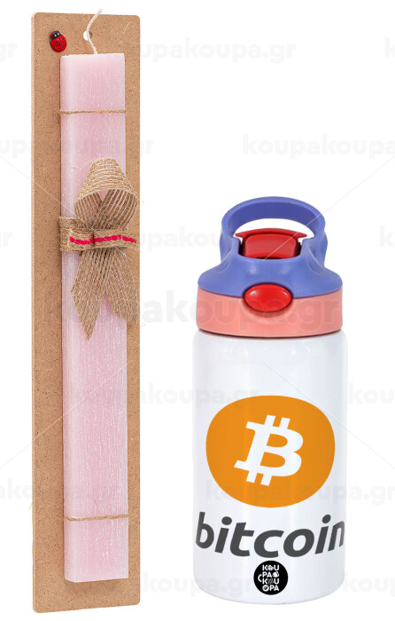 Bitcoin, Πασχαλινή Λαμπάδα με Παιδικό παγούρι θερμό, ανοξείδωτο, με καλαμάκι ασφαλείας, ροζ/μωβ (350ml) & κερί αρωματικό πλακέ (30cm) (ΡΟΖ)
