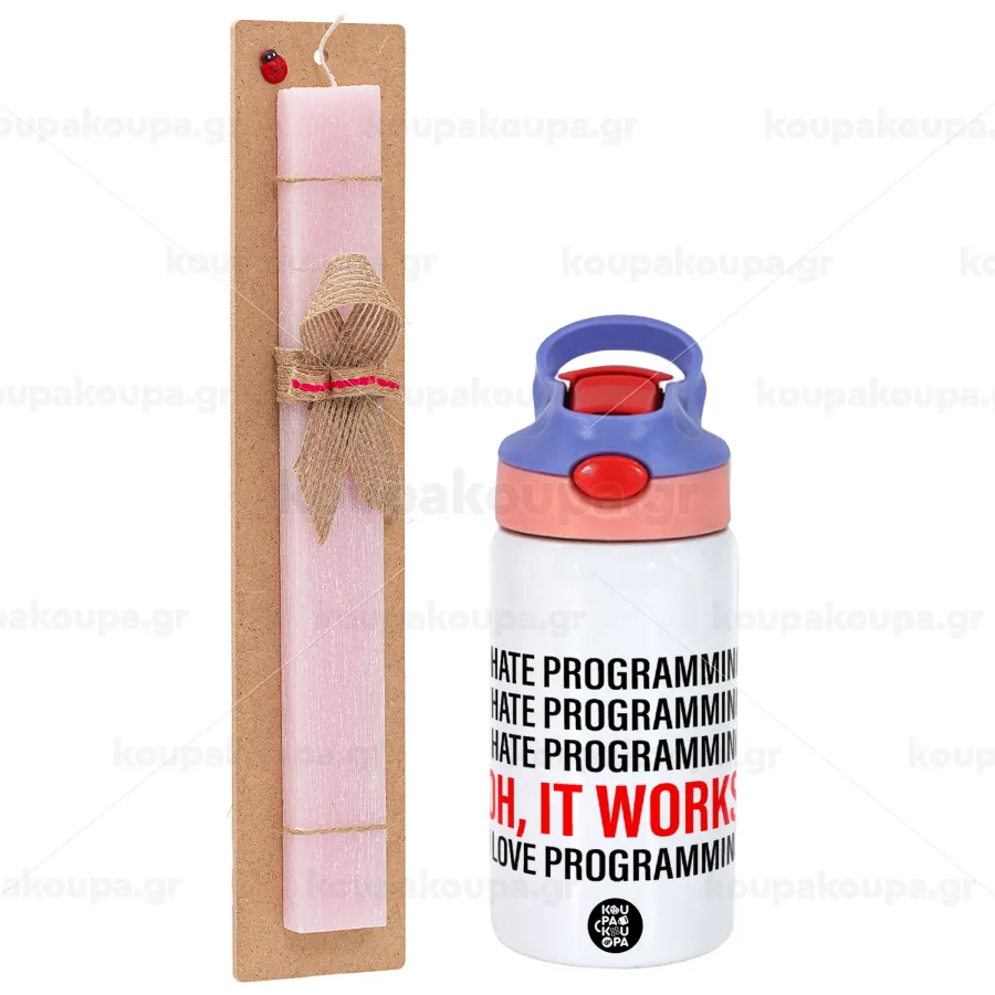 I hate programming!!!, Πασχαλινή Λαμπάδα με Παιδικό παγούρι θερμό, ανοξείδωτο, με καλαμάκι ασφαλείας, ροζ/μωβ (350ml) & κερί αρωματικό πλακέ (30cm) (ΡΟΖ)