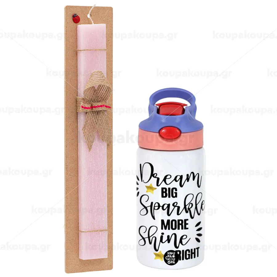 Dream big, Sparkle more, Shine bright, Πασχαλινή Λαμπάδα με Παιδικό παγούρι θερμό, ανοξείδωτο, με καλαμάκι ασφαλείας, ροζ/μωβ (350ml) & κερί αρωματικό πλακέ (30cm) (ΡΟΖ)