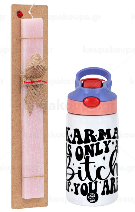 Karma is Only A Bitch if You Are, Πασχαλινή Λαμπάδα με Παιδικό παγούρι θερμό, ανοξείδωτο, με καλαμάκι ασφαλείας, ροζ/μωβ (350ml) & κερί αρωματικό πλακέ (30cm) (ΡΟΖ)