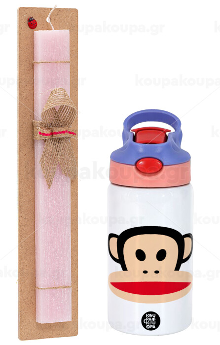 Monkey, Πασχαλινή Λαμπάδα με Παιδικό παγούρι θερμό, ανοξείδωτο, με καλαμάκι ασφαλείας, ροζ/μωβ (350ml) & κερί αρωματικό πλακέ (30cm) (ΡΟΖ)