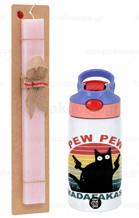 PEW PEW madafakas, Πασχαλινή Λαμπάδα με Παιδικό παγούρι θερμό, ανοξείδωτο, με καλαμάκι ασφαλείας, ροζ/μωβ (350ml) & κερί αρωματικό πλακέ (30cm) (ΡΟΖ)