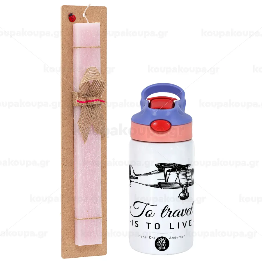 To travel is to live, Πασχαλινή Λαμπάδα με Παιδικό παγούρι θερμό, ανοξείδωτο, με καλαμάκι ασφαλείας, ροζ/μωβ (350ml) & κερί αρωματικό πλακέ (30cm) (ΡΟΖ)