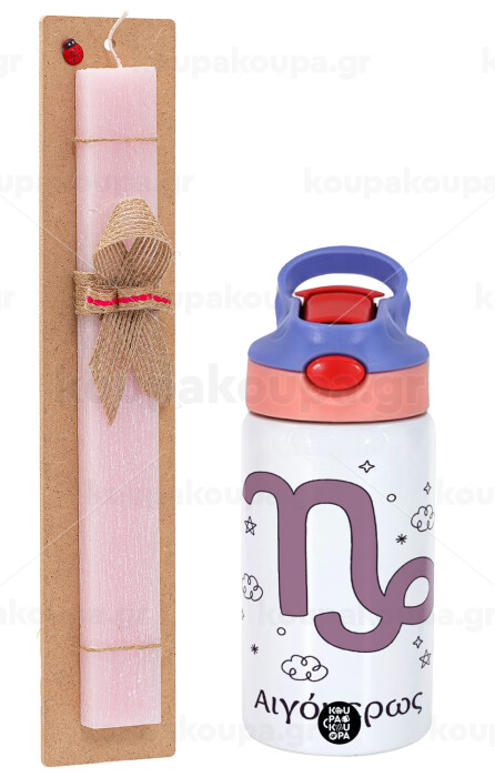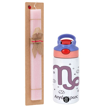 Ζώδια Αιγόκερως, Πασχαλινή Λαμπάδα με Παιδικό παγούρι θερμό, ανοξείδωτο, με καλαμάκι ασφαλείας, ροζ/μωβ (350ml) & κερί αρωματικό πλακέ (30cm) (ΡΟΖ)