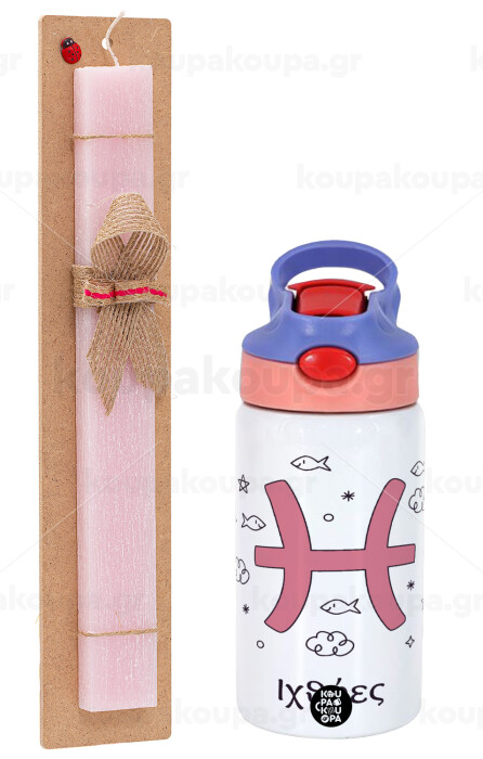 Ζώδια Ιχθύες, Πασχαλινή Λαμπάδα με Παιδικό παγούρι θερμό, ανοξείδωτο, με καλαμάκι ασφαλείας, ροζ/μωβ (350ml) & κερί αρωματικό πλακέ (30cm) (ΡΟΖ)