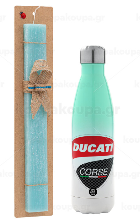 Ducati, Πασχαλινή Λαμπάδα με Μεταλλικό παγούρι θερμός Πράσινο/Λευκό (Stainless steel), διπλού τοιχώματος, 500ml & κερί αρωματικό πλακέ (30cm) (ΤΙΡΚΟΥΑΖ)