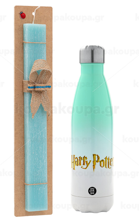 Harry potter movie, Πασχαλινή Λαμπάδα με Μεταλλικό παγούρι θερμός Πράσινο/Λευκό (Stainless steel), διπλού τοιχώματος, 500ml & κερί αρωματικό πλακέ (30cm) (ΤΙΡΚΟΥΑΖ)