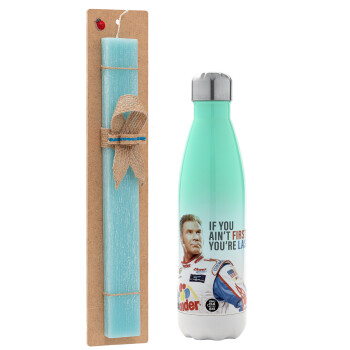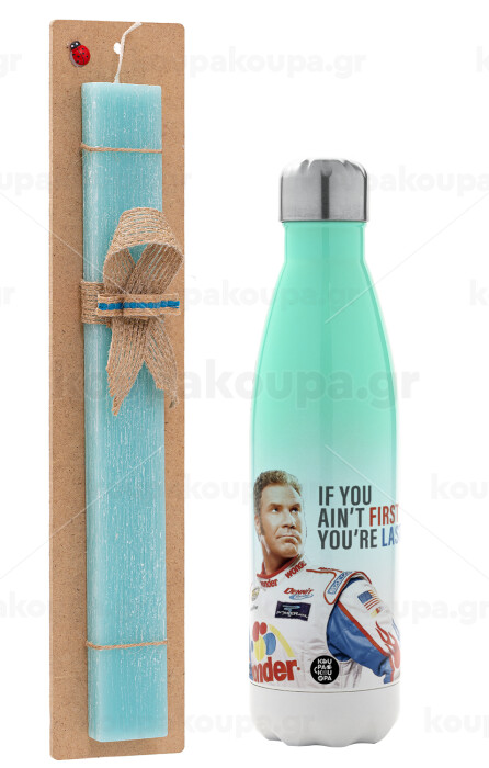 If You Ain't First You're Last Ricky Bobby, Talladega Nights, Πασχαλινή Λαμπάδα με Μεταλλικό παγούρι θερμός Πράσινο/Λευκό (Stainless steel), διπλού τοιχώματος, 500ml & κερί αρωματικό πλακέ (30cm) (ΤΙΡΚΟΥΑΖ)