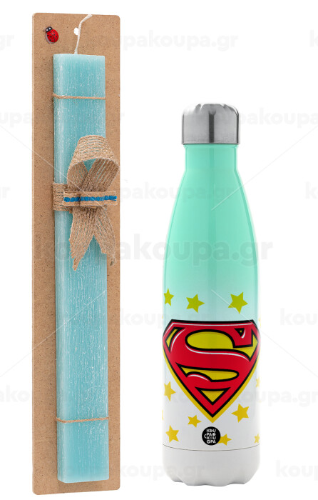Superman Blue, Πασχαλινή Λαμπάδα με Μεταλλικό παγούρι θερμός Πράσινο/Λευκό (Stainless steel), διπλού τοιχώματος, 500ml & κερί αρωματικό πλακέ (30cm) (ΤΙΡΚΟΥΑΖ)