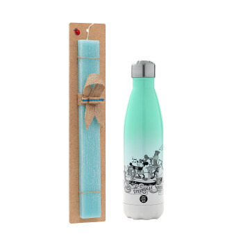 Πασχαλινή Λαμπάδα με Μεταλλικό παγούρι θερμός Πράσινο/Λευκό (Stainless steel), διπλού τοιχώματος, 500ml & κερί αρωματικό πλακέ (30cm) (ΤΙΡΚΟΥΑΖ) με θέμα Παιδικά
