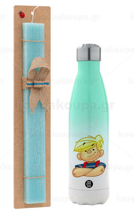 Ντένις ο τρομερός, Πασχαλινή Λαμπάδα με Μεταλλικό παγούρι θερμός Πράσινο/Λευκό (Stainless steel), διπλού τοιχώματος, 500ml & κερί αρωματικό πλακέ (30cm) (ΤΙΡΚΟΥΑΖ)