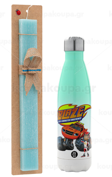 Ο Μπλέιζ και οι Φίλοι του, Πασχαλινή Λαμπάδα με Μεταλλικό παγούρι θερμός Πράσινο/Λευκό (Stainless steel), διπλού τοιχώματος, 500ml & κερί αρωματικό πλακέ (30cm) (ΤΙΡΚΟΥΑΖ)