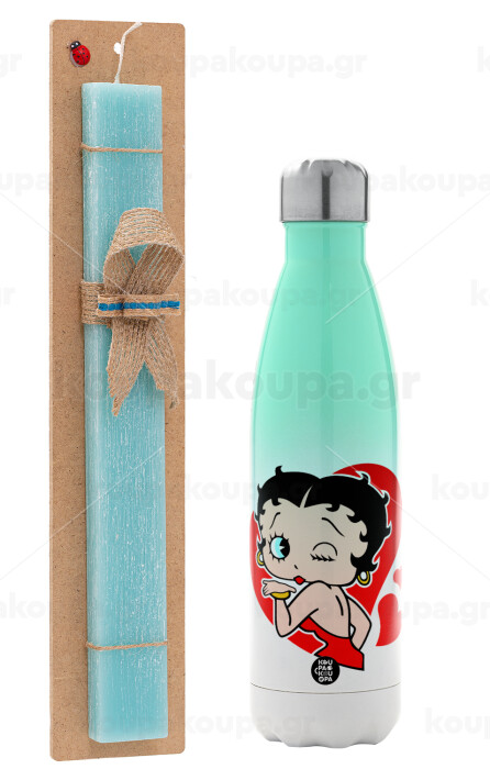 Betty Boop, Πασχαλινή Λαμπάδα με Μεταλλικό παγούρι θερμός Πράσινο/Λευκό (Stainless steel), διπλού τοιχώματος, 500ml & κερί αρωματικό πλακέ (30cm) (ΤΙΡΚΟΥΑΖ)