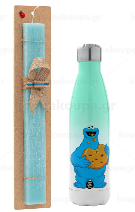 Cookie Monster, Πασχαλινή Λαμπάδα με Μεταλλικό παγούρι θερμός Πράσινο/Λευκό (Stainless steel), διπλού τοιχώματος, 500ml & κερί αρωματικό πλακέ (30cm) (ΤΙΡΚΟΥΑΖ)