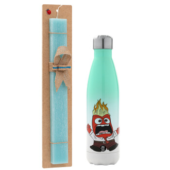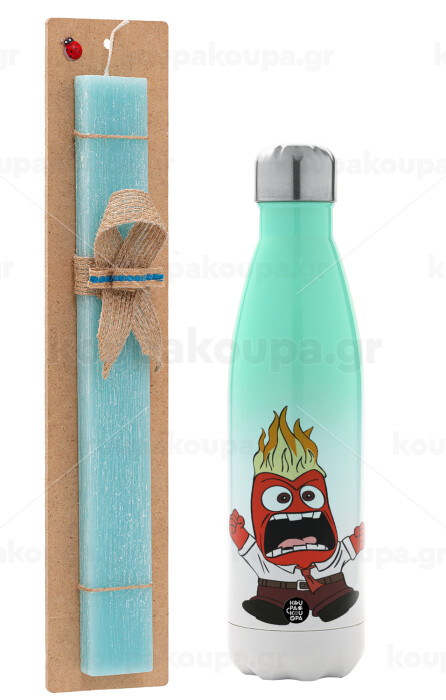 Inside Out θυμός, Πασχαλινή Λαμπάδα με Μεταλλικό παγούρι θερμός Πράσινο/Λευκό (Stainless steel), διπλού τοιχώματος, 500ml & κερί αρωματικό πλακέ (30cm) (ΤΙΡΚΟΥΑΖ)