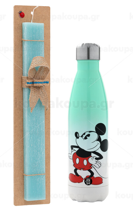 Mickey Classic, Πασχαλινή Λαμπάδα με Μεταλλικό παγούρι θερμός Πράσινο/Λευκό (Stainless steel), διπλού τοιχώματος, 500ml & κερί αρωματικό πλακέ (30cm) (ΤΙΡΚΟΥΑΖ)