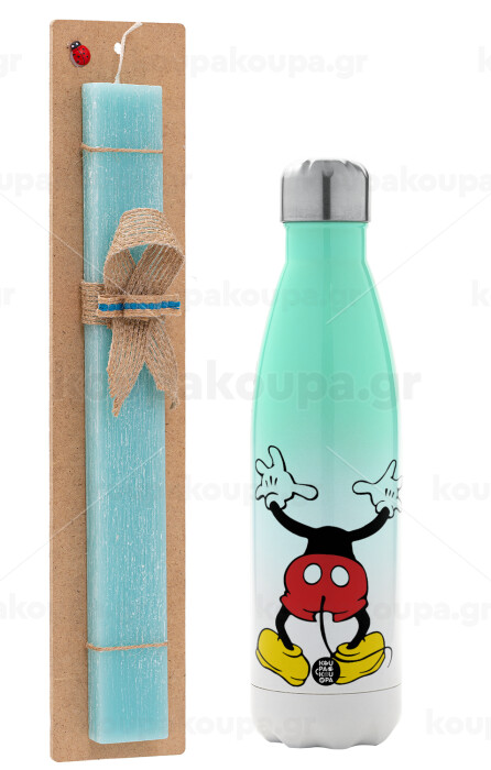 Mickey hide..., Πασχαλινή Λαμπάδα με Μεταλλικό παγούρι θερμός Πράσινο/Λευκό (Stainless steel), διπλού τοιχώματος, 500ml & κερί αρωματικό πλακέ (30cm) (ΤΙΡΚΟΥΑΖ)