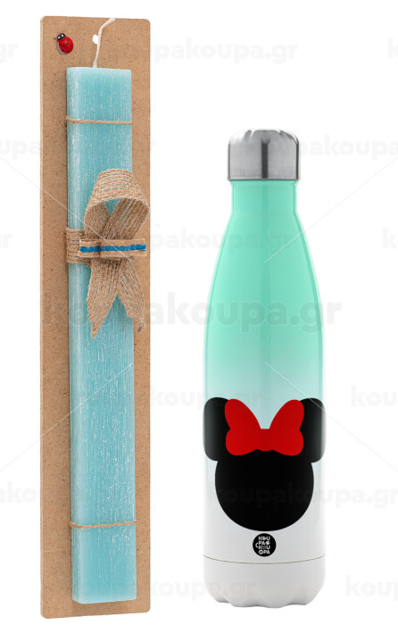 Minnie head, Πασχαλινή Λαμπάδα με Μεταλλικό παγούρι θερμός Πράσινο/Λευκό (Stainless steel), διπλού τοιχώματος, 500ml & κερί αρωματικό πλακέ (30cm) (ΤΙΡΚΟΥΑΖ)