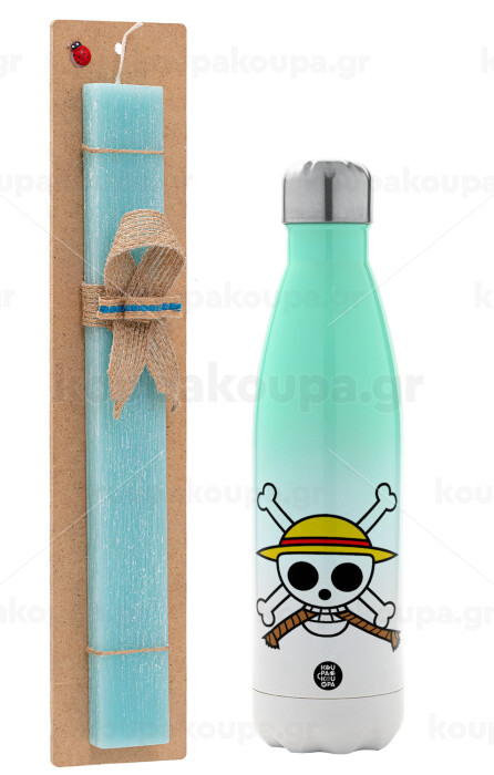 Onepiece skull, Πασχαλινή Λαμπάδα με Μεταλλικό παγούρι θερμός Πράσινο/Λευκό (Stainless steel), διπλού τοιχώματος, 500ml & κερί αρωματικό πλακέ (30cm) (ΤΙΡΚΟΥΑΖ)