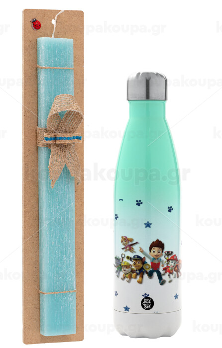 paw patrol, Πασχαλινή Λαμπάδα με Μεταλλικό παγούρι θερμός Πράσινο/Λευκό (Stainless steel), διπλού τοιχώματος, 500ml & κερί αρωματικό πλακέ (30cm) (ΤΙΡΚΟΥΑΖ)