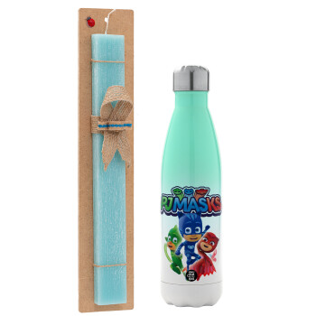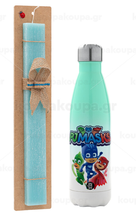 PJ masks, Πασχαλινή Λαμπάδα με Μεταλλικό παγούρι θερμός Πράσινο/Λευκό (Stainless steel), διπλού τοιχώματος, 500ml & κερί αρωματικό πλακέ (30cm) (ΤΙΡΚΟΥΑΖ)