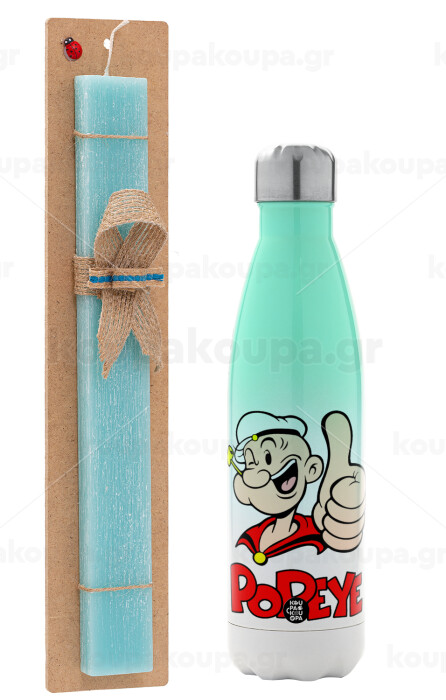 Popeye the sailor man, Πασχαλινή Λαμπάδα με Μεταλλικό παγούρι θερμός Πράσινο/Λευκό (Stainless steel), διπλού τοιχώματος, 500ml & κερί αρωματικό πλακέ (30cm) (ΤΙΡΚΟΥΑΖ)
