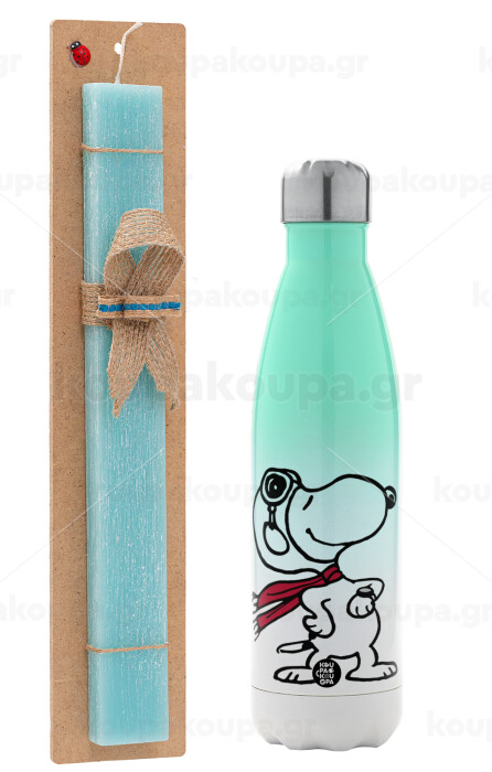 Snoopy ο πιλότος, Πασχαλινή Λαμπάδα με Μεταλλικό παγούρι θερμός Πράσινο/Λευκό (Stainless steel), διπλού τοιχώματος, 500ml & κερί αρωματικό πλακέ (30cm) (ΤΙΡΚΟΥΑΖ)