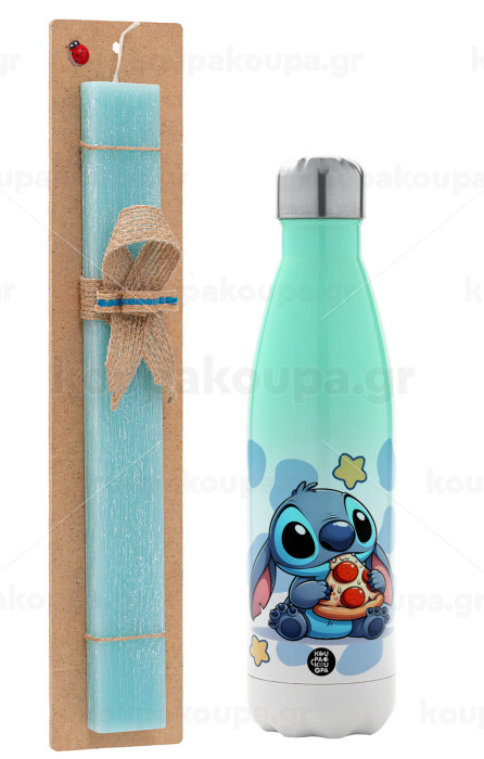 Stitch Pizza, Πασχαλινή Λαμπάδα με Μεταλλικό παγούρι θερμός Πράσινο/Λευκό (Stainless steel), διπλού τοιχώματος, 500ml & κερί αρωματικό πλακέ (30cm) (ΤΙΡΚΟΥΑΖ)