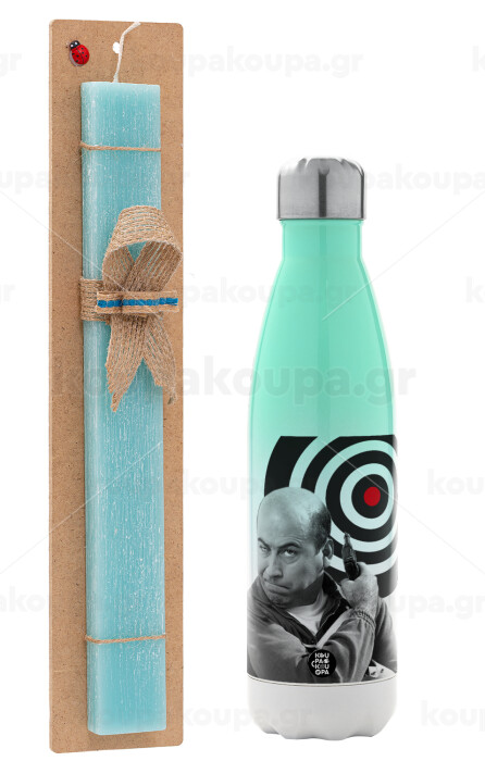 Θου Βου Φαλακρός Πράκτωρ, Πασχαλινή Λαμπάδα με Μεταλλικό παγούρι θερμός Πράσινο/Λευκό (Stainless steel), διπλού τοιχώματος, 500ml & κερί αρωματικό πλακέ (30cm) (ΤΙΡΚΟΥΑΖ)