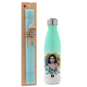 Dua lipa, Πασχαλινή Λαμπάδα με Μεταλλικό παγούρι θερμός Πράσινο/Λευκό (Stainless steel), διπλού τοιχώματος, 500ml & κερί αρωματικό πλακέ (30cm) (ΤΙΡΚΟΥΑΖ)